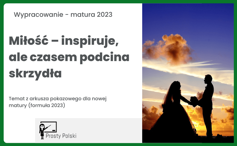 W moim sklepie możesz nabyć wzorcową rozprawkę maturalną (wypowiedź argumentacyjną) na temat: „Miłość – inspiruje, ale czasem podcina skrzydła”. Temat ten pojawił się (jako jeden z dwóch do wyboru) w arkuszu pokazowym dla nowej formuły matury, czyli matury obowiązującej od 2023 roku.