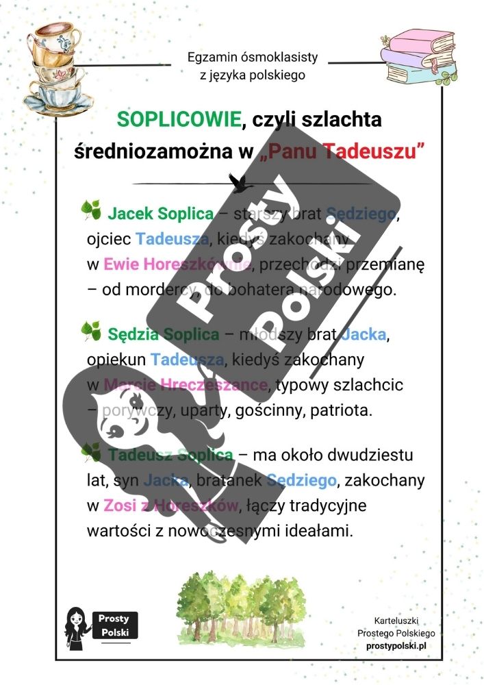 Przejrzyste i uporządkowane opracowanie bohaterów epopei „Pan Tadeusz” Adama Mickiewicza, przygotowane specjalnie z myślą o egzaminie ósmoklasisty z języka polskiego. Materiał koncentruje się na dwóch najważniejszych rodach występujących w utworze – Horeszkach i Soplicach – oraz na ich przedstawicielach.