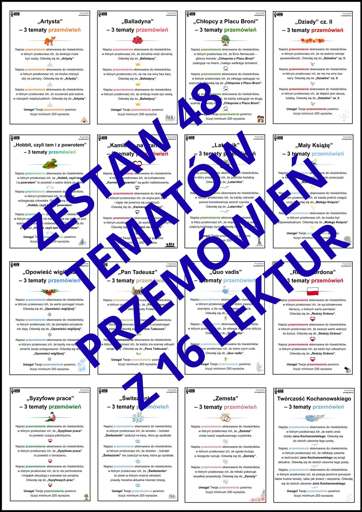 W skład zestawu wchodzi 48 tematów przemówień z 16 lektur obowiązujących na egzaminie ósmoklasisty, a dokładniej: